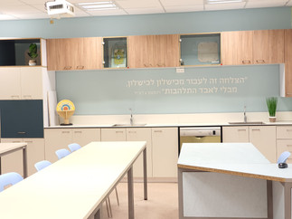 לשולחנות הקיימים החלפנו פלטות והוספנו כיסאות תלמיד נוחים ונעימים. לטובת האיחסון והניסויים בכיתה תוכנן מטבח המשתלב על הצנרת הקודמת בכיתה. לכל אלו הוספו מדבקות קיר מעוצבות, תמונות ודגמים.